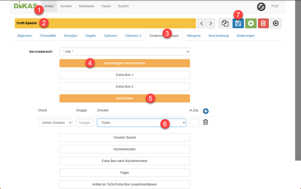 Wir wechseln auf Hauptmenü / Backend / Artikel (1) und wählen den Artikel „Craft-Spezial“ (2) aus. Im Artikel gehen wir nach bekanntem Muster zum Reiter „Geräte Einstellungen“ (3), aktivieren die Konfiguration mit „Einstellungen überschreiben“ (4), Sammelbon (5) und den Drucker „Theke“ (6). Diese Konfiguration speichern wir mit einem Klick auf die Diskette (7).