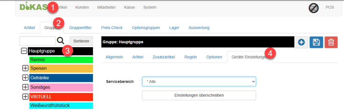 Dazu wechseln wir zu Hauptmenü / Backend / Artikel / Gruppen und klicken auf die „Hauptgruppe“. Hier wechseln wir auf den Reiter „Geräte Einstellungen“.