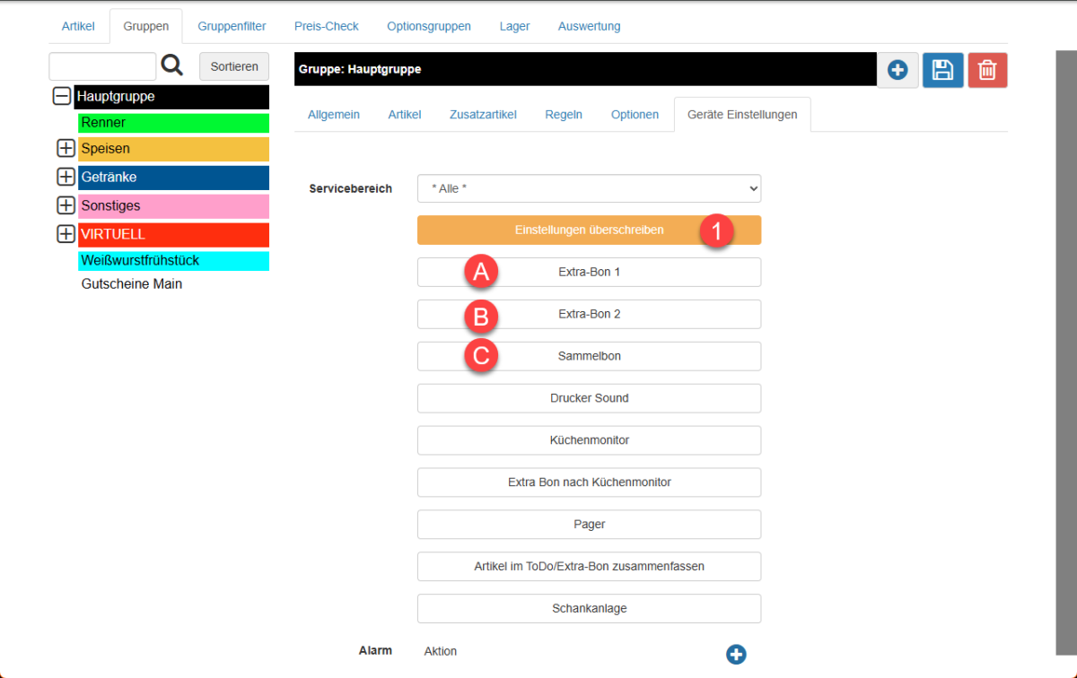 Die erste Druckweiche, die konfiguriert wird, ist die „allgemeine Weiche“ für alles. Alle Artikel in sämtlichen Warengruppen (darum Hauptgruppe) und alle Servicebereiche (* Alle). Hierzu aktivieren wir die Konfiguration mit einem Klick auf „Einstellungen überschreiben“ (1).