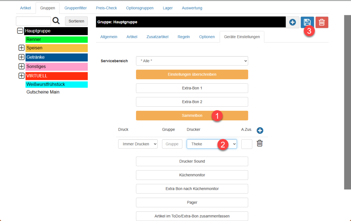 Nun konfigurieren wir einen Sammelbondruck für den Drucker „Theke“, indem wir „Sammelbon“ aktivieren (1) und dann den Drucker via DropDown auswählen (2). Nun müssen wir diese Konfiguration nur noch speichern (3).