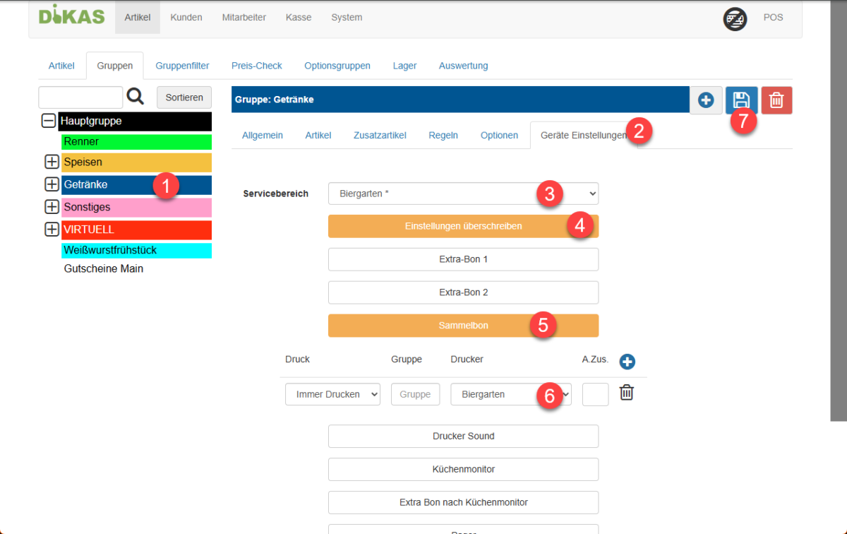 Nun wählen wir im DropDown „Servicebereich“ den Servicebereich „Biergarten“ (3) aus und aktivieren die Konfiguration mit „Einstellungen überschreiben“ (4). Wir klicken auf „Sammelbon“ (5) und wählen im DropDown Drucker den „Biergarten“-Drucker (6). Diese Konfiguration speichern wir mit einem Klick auf die Diskette (7).