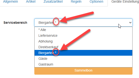 Stellen wir uns vor, wir haben einen Gastraum und einen Biergarten. Der Biergarten hat draußen eine eigene Schanktheke. Alle Bestellungen für Getränke aus dem Servicebereich „Biergarten“ sollen nun an diesem „Biergarten“-Drucker gedruckt werden. Alle Getränke, die von den anderen Servicebereichen aus bestellt werden, nach wie vor auf dem „Theke“-Drucker.