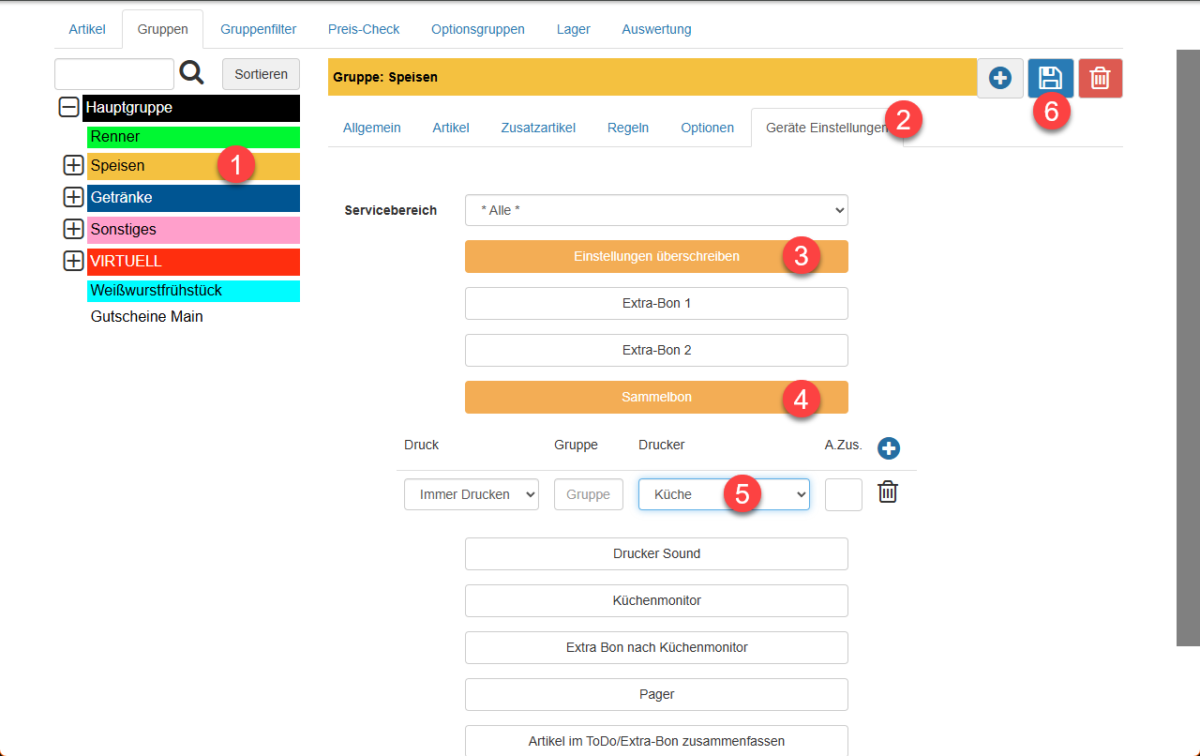 Nun aktivieren wir wie oben die Konfiguration mit einem Klick auf „Einstellungen überschreiben“ (3), wählen „Sammelbon“ (4) und den Drucker „Küche“ (5). Diese Konfiguration speichern wir mit einem Klick auf die Diskette (6).