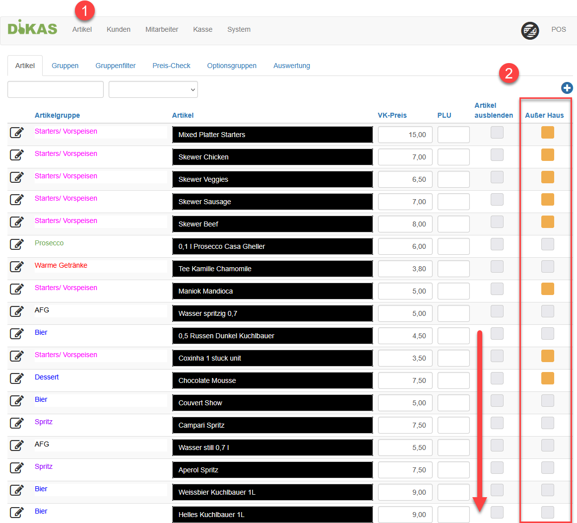 Im Backend / Artikel (1) sehen Sie alle ihre in der Kasse angelegten Artikel. In der Spalte „Außer Haus“ stellen Sie ein, ob der jeweilige Artikel beim Außer-Haus-Verkauf reduziert verkauft werden darf. Das betrifft alle Ihre Speisen. Bitte scrollen Sie in der Liste nach unten und prüfen bzw. korrigieren Sie die Einstellung, damit bei sämtlichen „Speisen“-Artikeln das Quadrat orange (aktiv) und bei allen „nicht-Speisen“ grau ist.