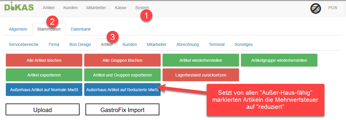2) Stammdaten / Artikel / Außerhaus Artikel auf Reduzierte MwSt