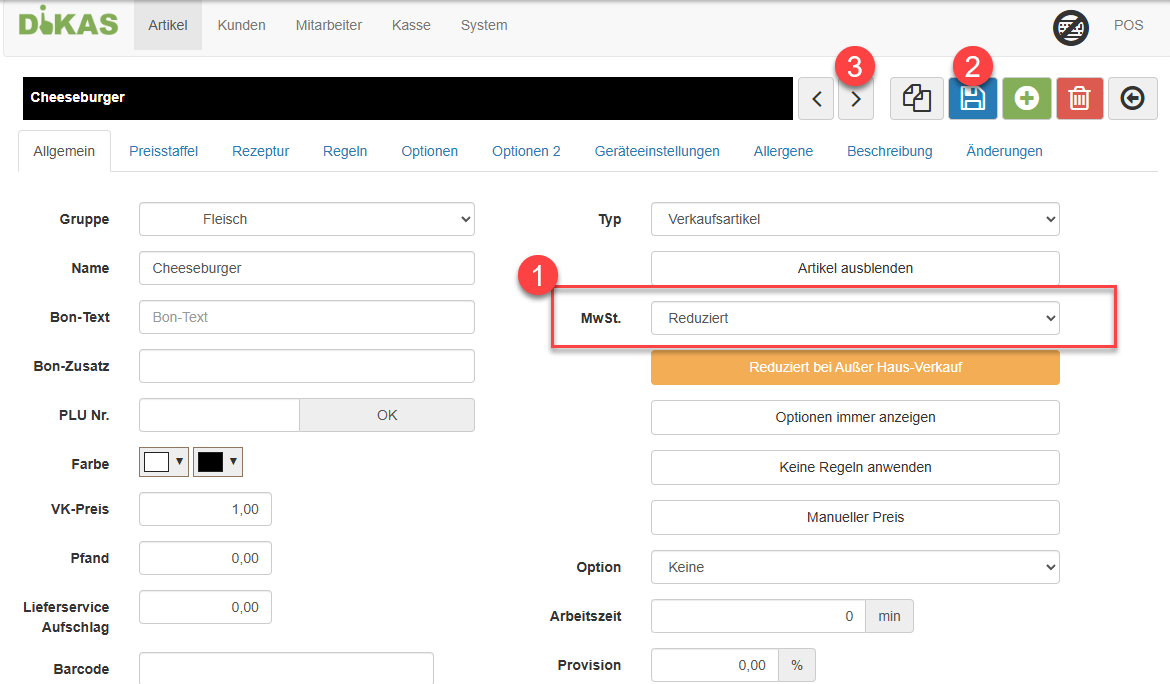 - Sollten noch Speise-Artikel mit dem „Normal“ Steuersatz übrig sein, korrigieren Sie diese mit einem Klick auf den Drop-Down „MwSt.“ und Auswahl von „Reduziert“. Speichern Sie die Änderung mit einem Klick auf das blaue Diskette-Symbol (2).