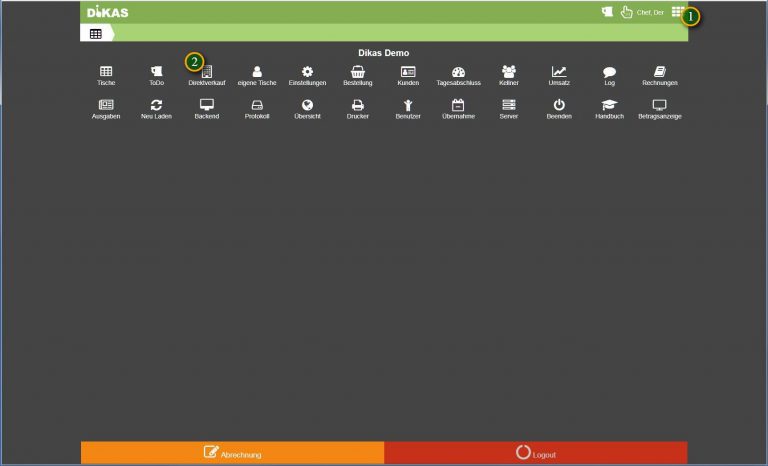 Wir wechseln über „Menü“ und „Direktverkauf“ in den POS-Modus.