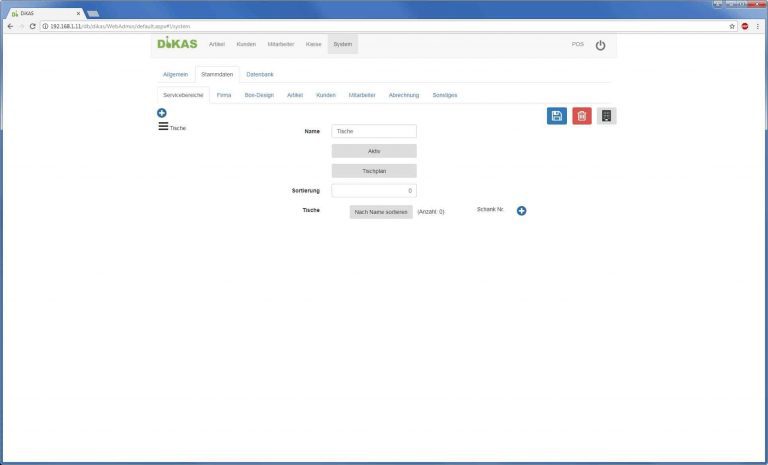 Wir wählen im Backend das Menü »System«, dort den Reiter »Stammdaten« und befinden uns nun im Sub-Reiter »Servicebereiche«.