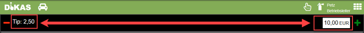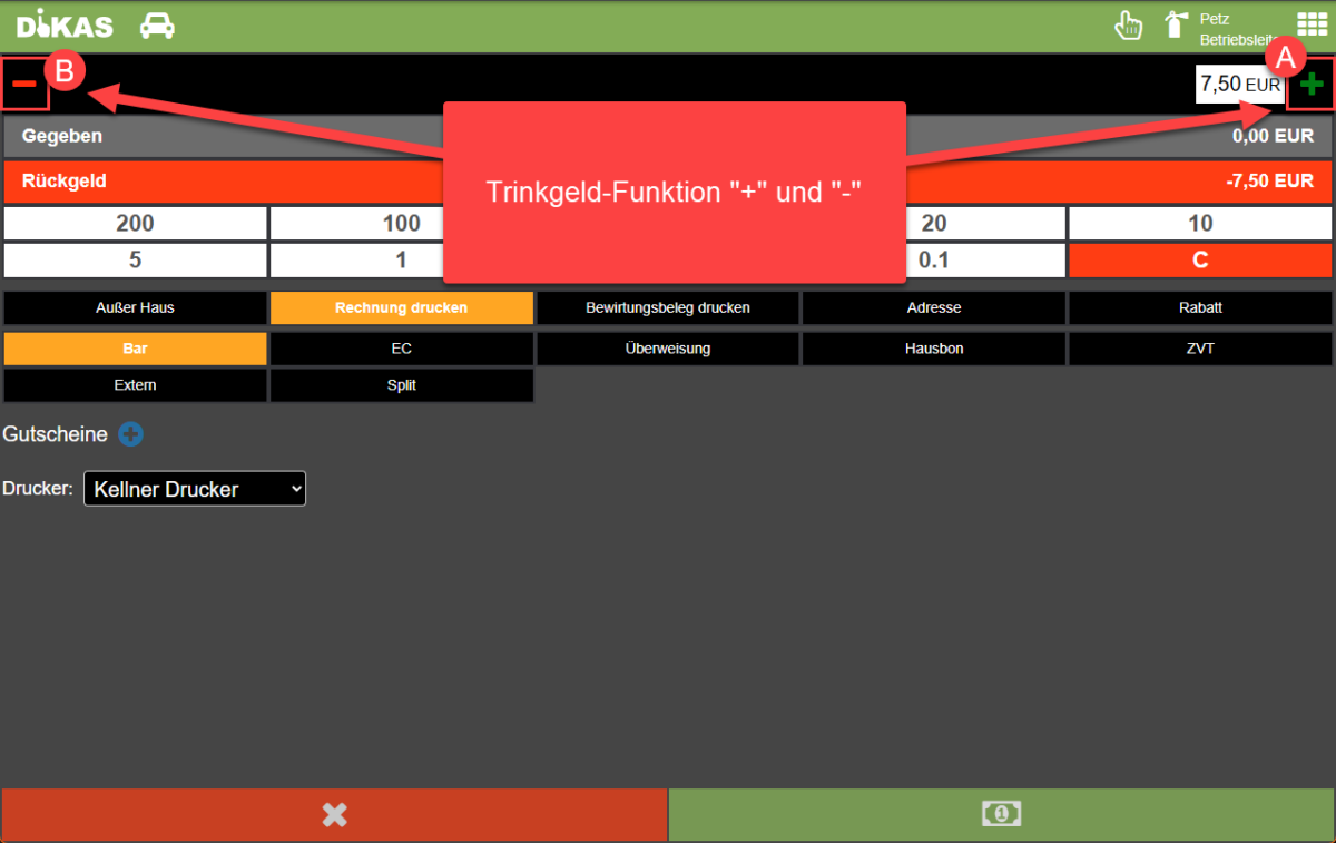 Die Trinkgeld-Funktion ist in dem schwarzen Balken verfügbar, der den zu kassierenden Gesamtbetrag ausweist. Mit dem grünen + (A) wird der Betrag erst auf die nächsten vollen 50 Cent erhöht, dann mit jedem weiteren Klick um 50 Cent. Mit dem roten – (B) wird der Betrag wieder um 50 Cent verringert.