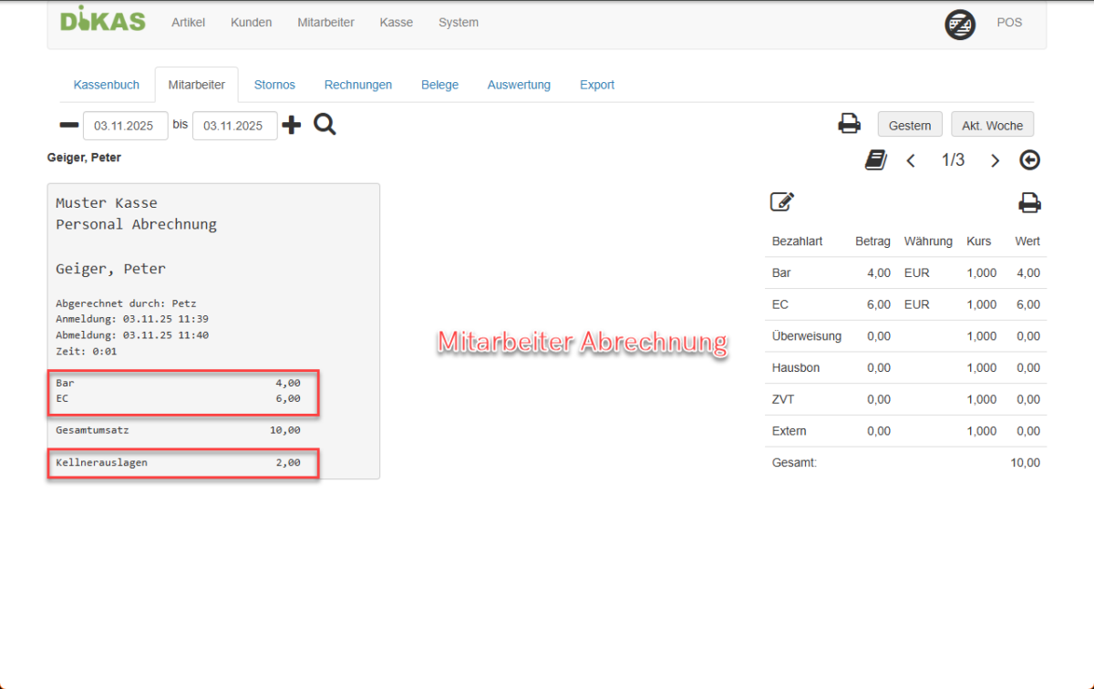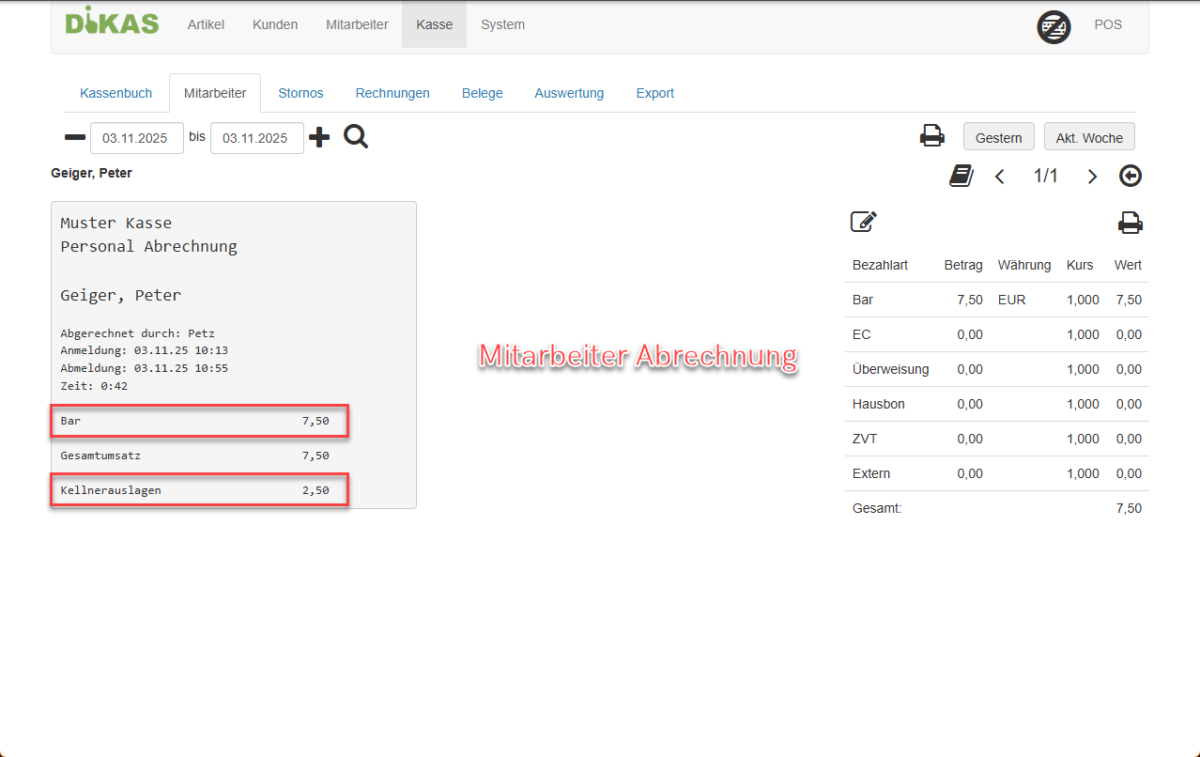 Schritt 3: Mitarbeiter-Abrechnung / Tagesabschluss mit Kellnerauslagen