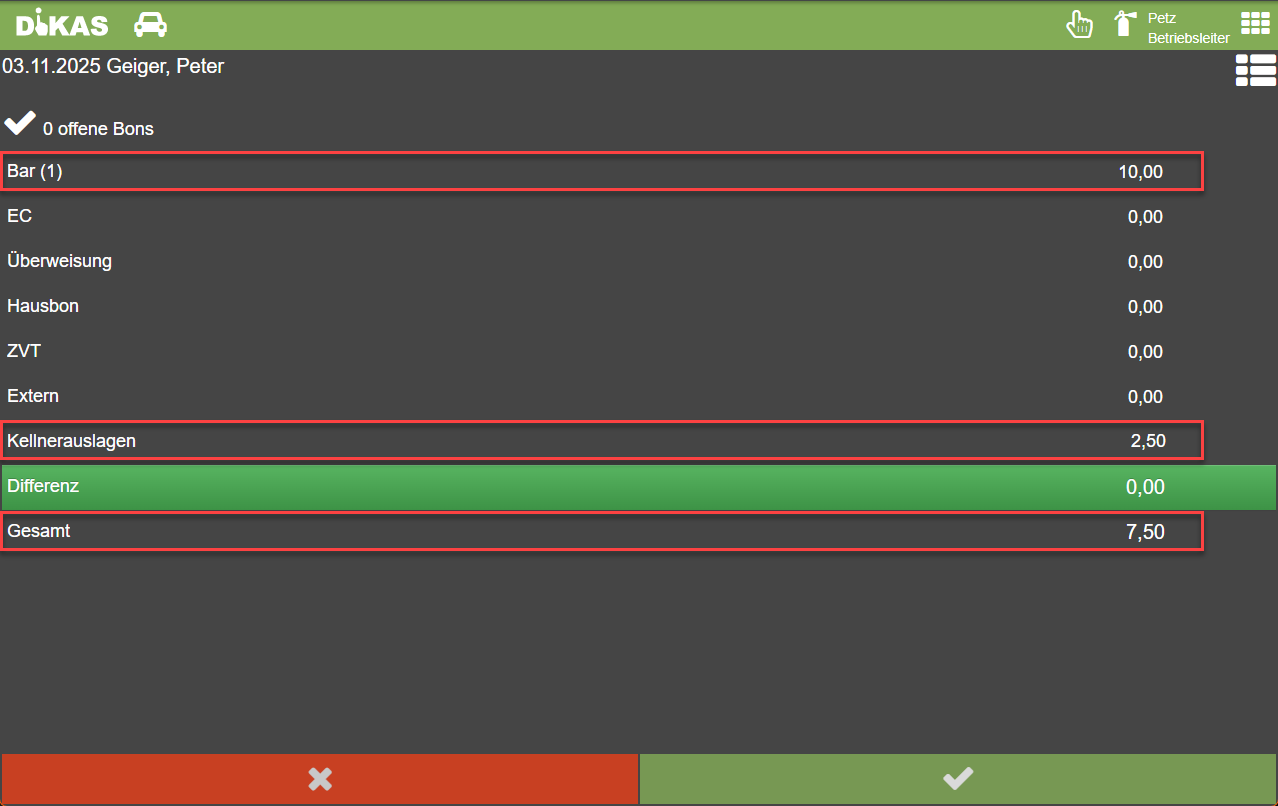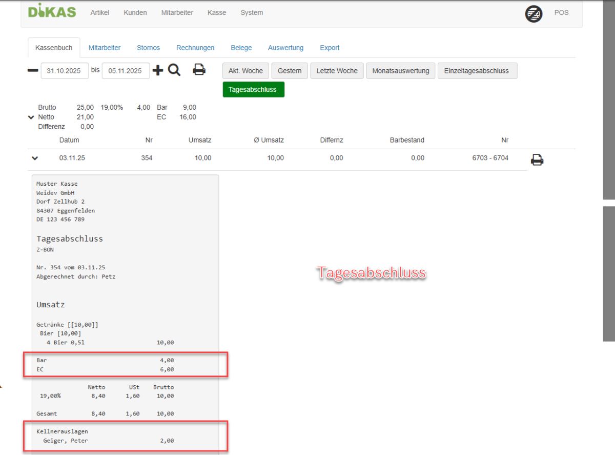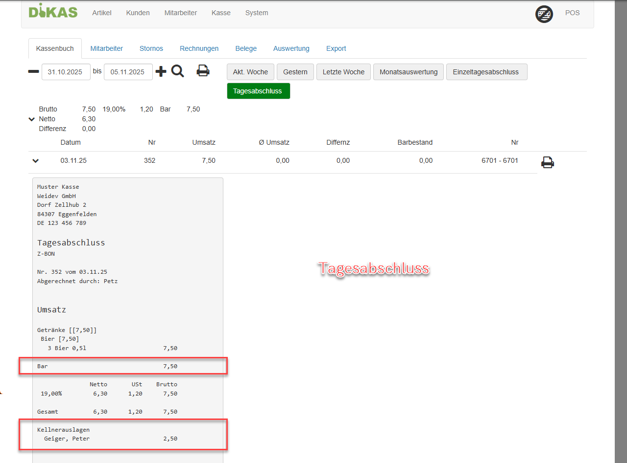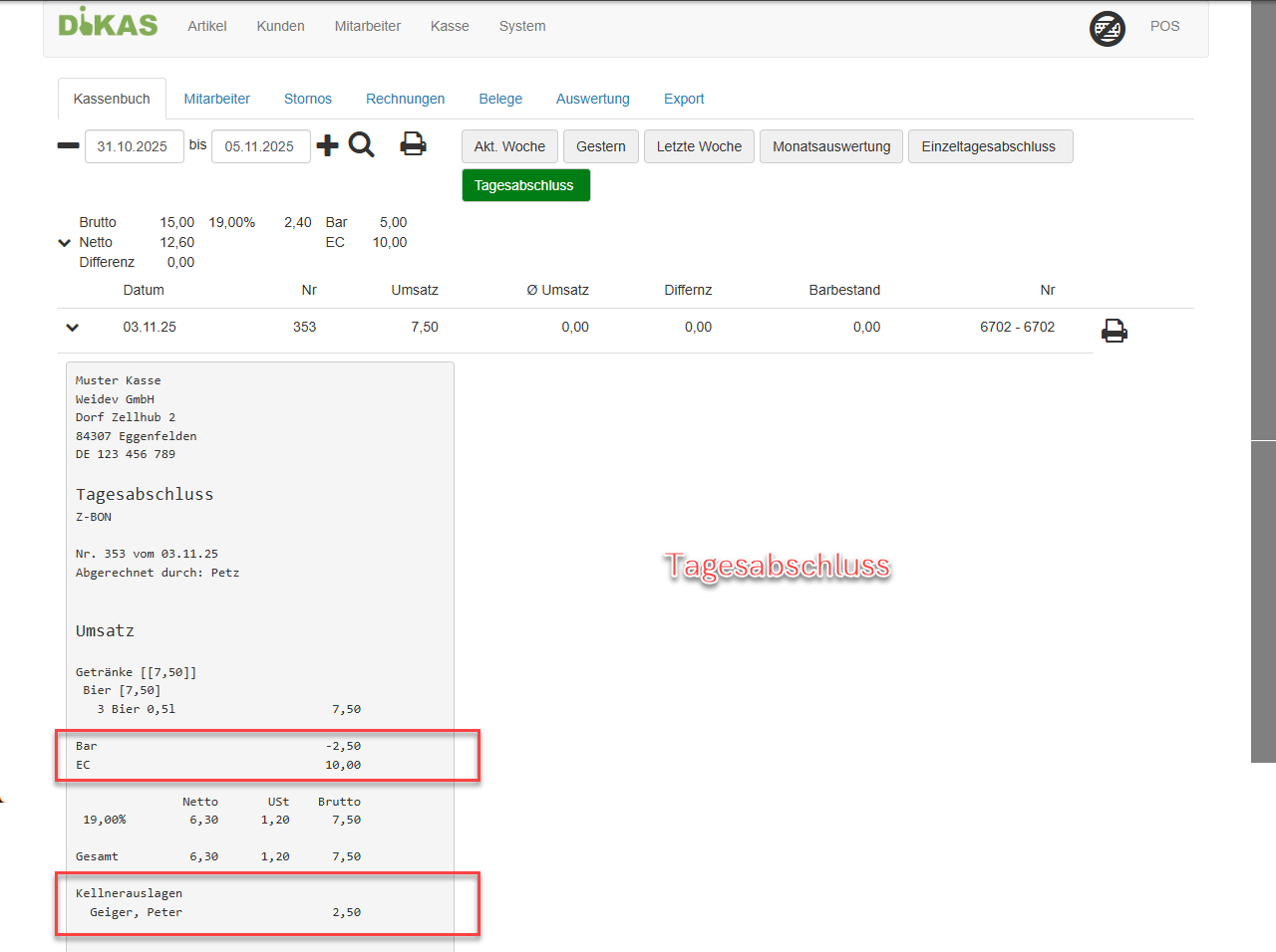3) Kellnerauslagen auf dem Tagesabschluss anzeigen