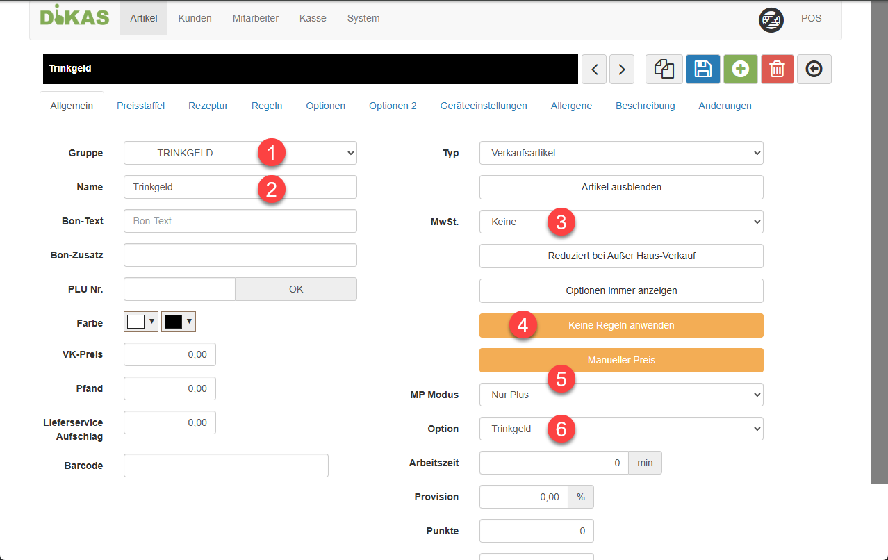 - Der Trinkgeld-Artikel gehört in eine Gruppe „Sonstiges“ oder eine eigens dafür angelegte Trinkgeld-Gruppe. Bitte nicht in reguläre Gruppen wie Speisen oder Getränke einhängen, weil das die Auswertung der jeweiligen Gruppe verzerrt.
