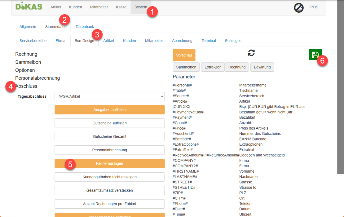 Wir wechseln zu Backend / System / Stammdaten / Bon-Design und aktivieren unter „Abschluss“ die Option „Kellnerauslagen“: