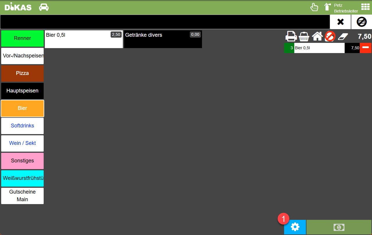 Wir sammeln unsere Artikel, die kassiert werden sollen, wie gewohnt im Direktverkauf im Warenkorb und im Tisch-Betrieb im Aktionsbereich. Beim Direktverkauf müssen wir dann auf das blaue Zahnrad klicken, falls wir Trinkgeld erfassen möchten (1) – und nicht direkt abkassieren: