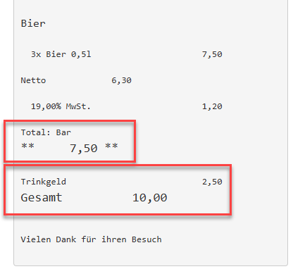Auf dem Kassenbon wird der Umsatz, dann unser Trinkgeld und letztlich der Insgesamt-Endbetrag ausgewiesen: