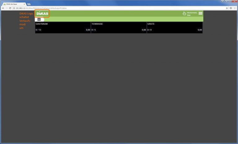 Ist die Option »Logo, Tischgruppen« aktiviert, schaltet DiKAS bei einem Klick auf das »DiKAS«-Logo zwischen folgenden Modi hin und her: Gastraum / Terrasse / Gäste.
